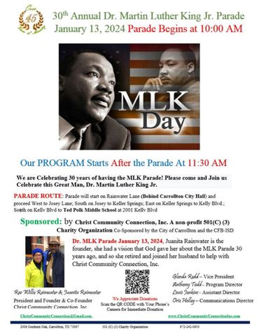 Together Rev. Willie and Juanita Rainwater make up the Founders along with Volunteers that work tirelessly to make up Christ Community Connection Inc. They have been working for over 25 years to better this Community that they call home. Juanita Rainwater had the vision to bring the Community together by celebrating Dr. Martin Luther King Jr. birthday with a Parade. She worked in the public arena till God gave her the vision how to bring the community together. So she retired and joined Christ Community Connection fulltime, working with Rev. Willie Rainwater to do the MLK Parade, over 27 years now, she saw a need and had a vision and together with Christ Community Connection she continues the MLK Parade.